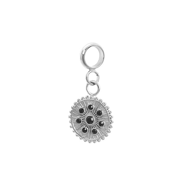 - De hanger bestaat uit een ronde vorm die is ingelegd met zwartkleurige zirconia's en heeft een diameter van 13mm.
