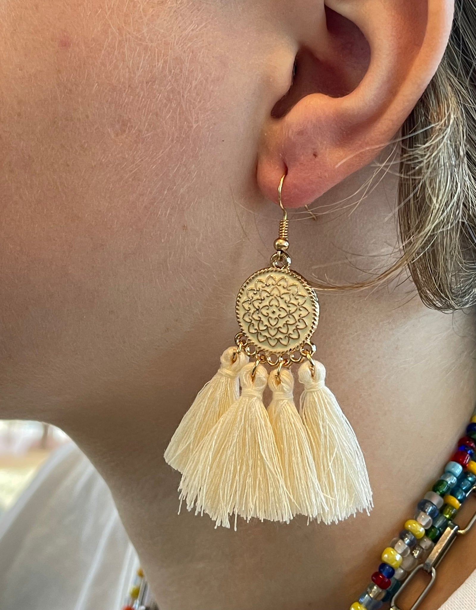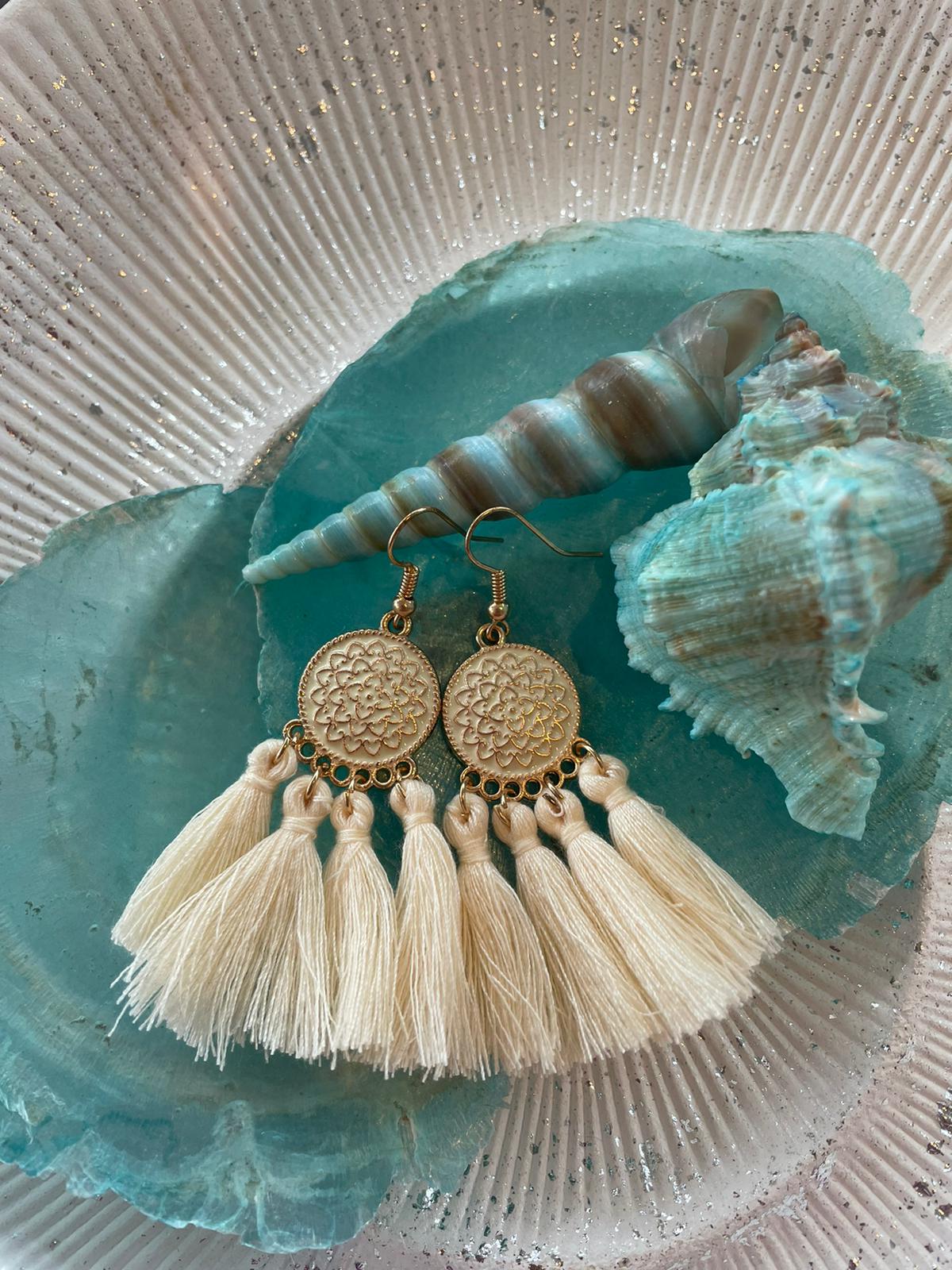Hippe Ibiza Oorbel met 3 ecru kwastjes